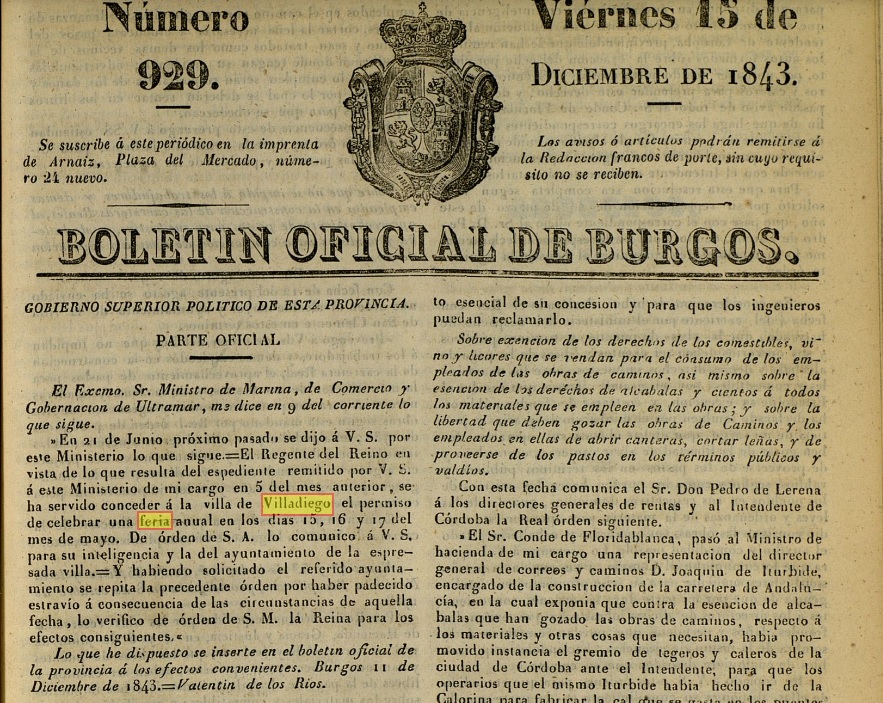 San Isidro: 1843. Aparece su concesión publicada en el B.O. de Burgos del 15 diciembre de 1843. Se anuncia para el 15, 16 y 17 de mayo. En 1934 se anuncia como nueva creación. Fuente: Diario de Burgos del 12 de mayo de 1934. La explicación posible es que dejara de realizarse y hubo desconocimiento de que se había hecho anterioremente.