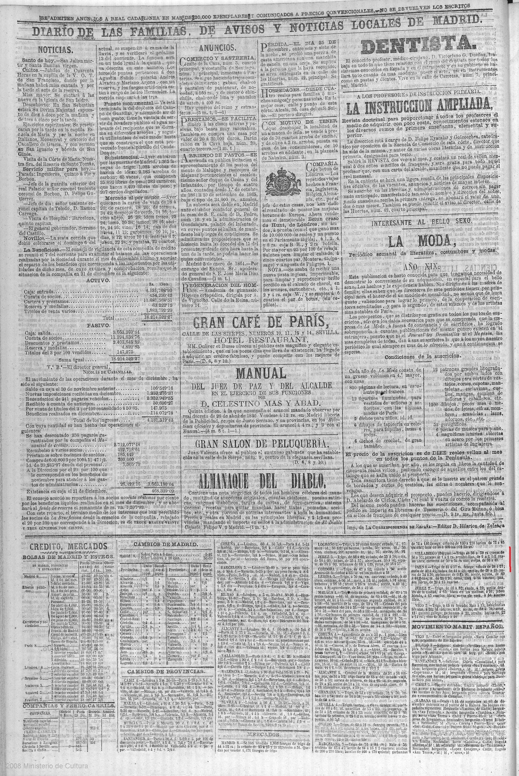 - El Español. 19 de febrero de 1836. En la sección de Mercados Españoles se pueden leer los precios de distintos cereales, legumbres, vino y ganado del 1 al 31 de enero.